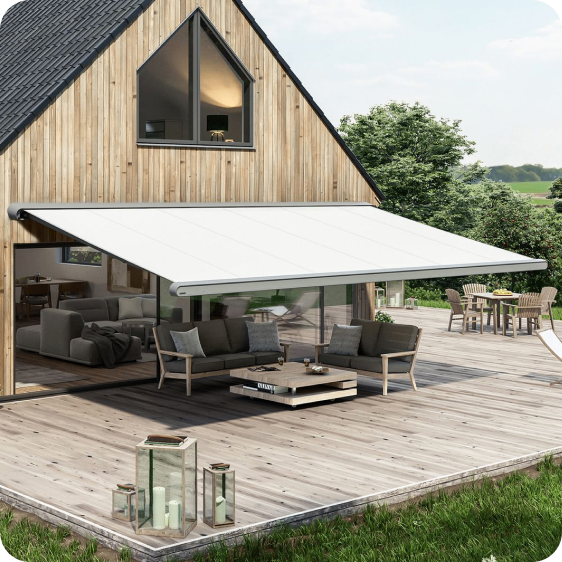 Basta con pulsar un botón para que el perfil embellecedor opcional cree un espacio exterior incomparable y privado. Súper-sombra está equipada de serie con motor radiocontrolado y telecontrol markilux.