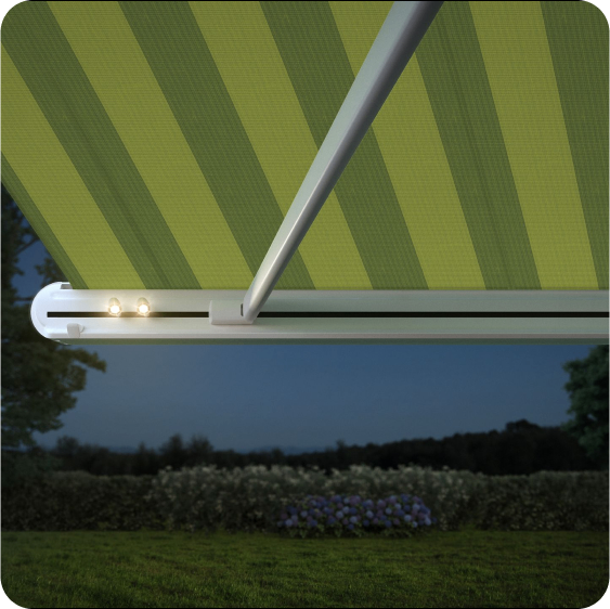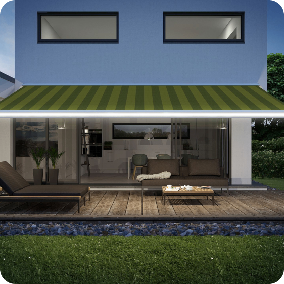 Los brillantes toques de luz transforman el espacio bajo el toldo en un oasis de bienestar al atardecer.